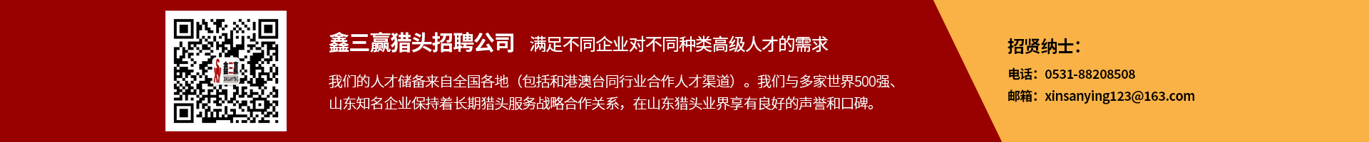 鑫三贏獵頭招聘公司(0531-88208508)是山東本土的知名專業(yè)獵頭招聘公司,幫助企業(yè)解決中高端招聘難題 ,免費幫助人才推薦更好的工作機會。公司總部位于山東省省會濟南市。我們致力服務于山東省內大中型內外資企業(yè),我們通過對客戶企業(yè)的組織結構、相關業(yè)務和具體職位的研究、分析,能夠很好的與企業(yè)及候選人進行溝通,滿足不同企業(yè)對不同種類高級人才的需求,我們的人才儲備來自全國各地(包括和港澳臺同行業(yè)合作人才渠道)。我們與多家世界500強、山東知名企業(yè)保持著長期獵頭服務戰(zhàn)略合作關系,在山東獵頭業(yè)界享有良好的聲譽和口碑。